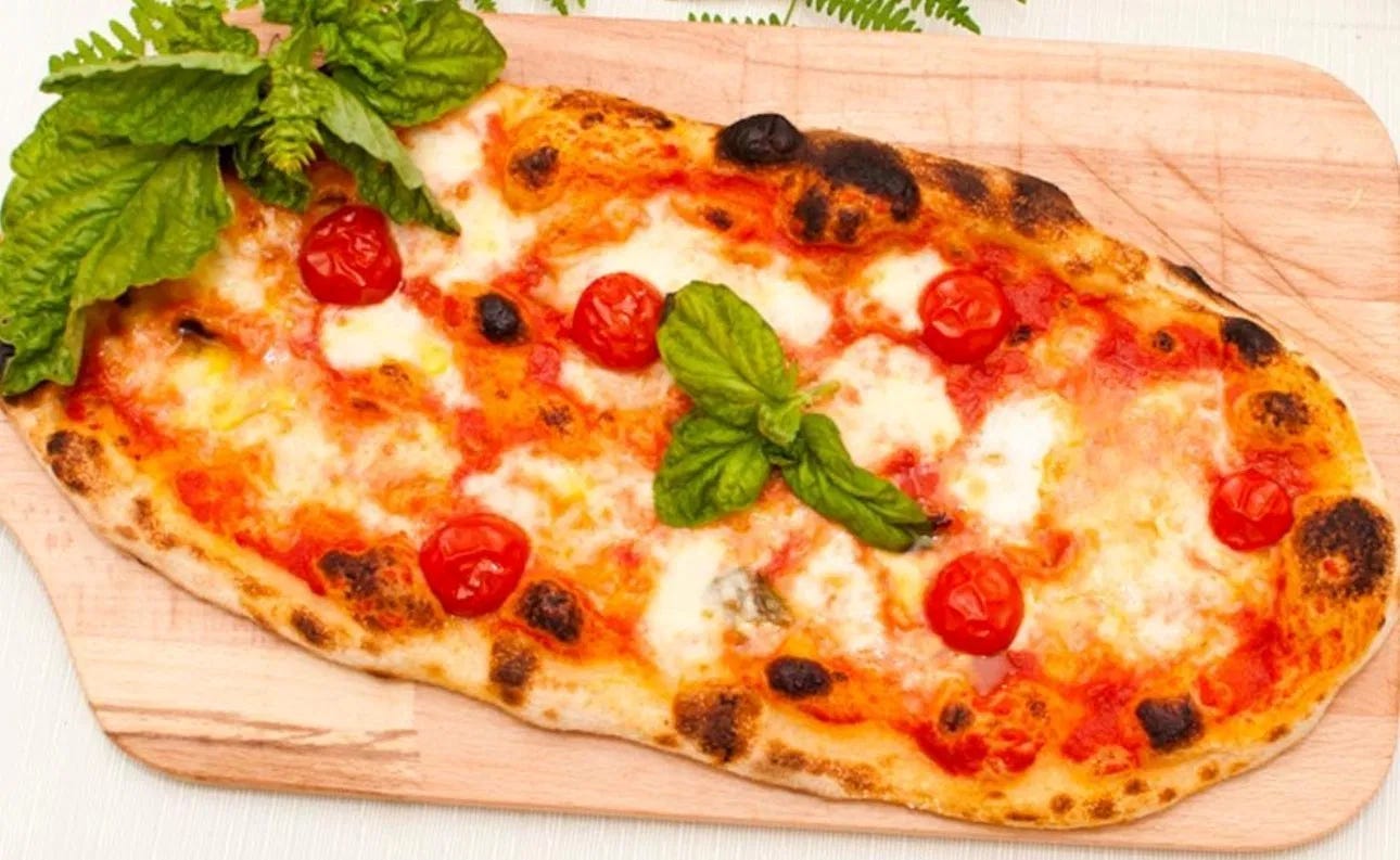 The pinsa Romana is a traditional Roman pizza that has very little resemblance to a classic Neapolitan pizza. The word pinsa is from the Latin "pinsere" to lengthen or stretch, which explains the shape of this fantastic Roman oval-shaped product, more digestible than the cousin pizza, due to a lighter dough and the presence of cold water, in the mix. It is nothing more than a schiacciatina or flatbread born before the pizza during Roman times, uniting different ground cereals (millet, oats, barley, and later farro, with water, salt, and aromatic herbs. It is another form of focaccia, made by local Lazio farmers. The classic recipe uses a mix of different flours, such as soft wheat, soy, and rice mixed with cold water. The water amount has to be 75-80 % of the dough and left to rise for 24 hours, to a maximum of 150 hours. The lengthy rising process provides a pinsa that is fragrant and easily digestible.
